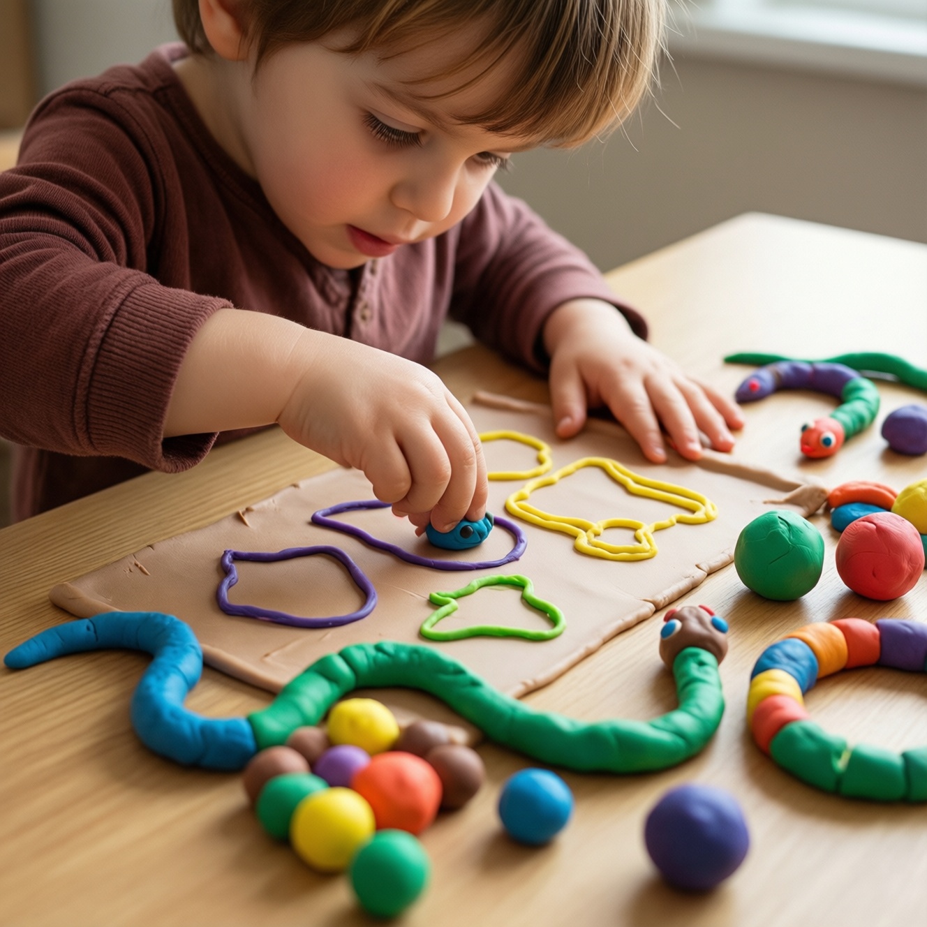 И наконец, небольшое уточнение по запросам: многие ищут "пластилиновые коврики для детей купить" или "playdough mats купить", потому что хотят готовое решение "достал и занимайся". Но даже при покупке набора стоит оставлять место для творчества: один и тот же коврик можно усложнять - просить выкладывать контур двумя цветами, чередовать шарик и жгутик, считать элементы, называть части картинки, придумывать короткий рассказ по готовому изображению. Так обычное упражнение превращается в полноценную развивающую игру, которая действительно помогает руке созреть к письму.