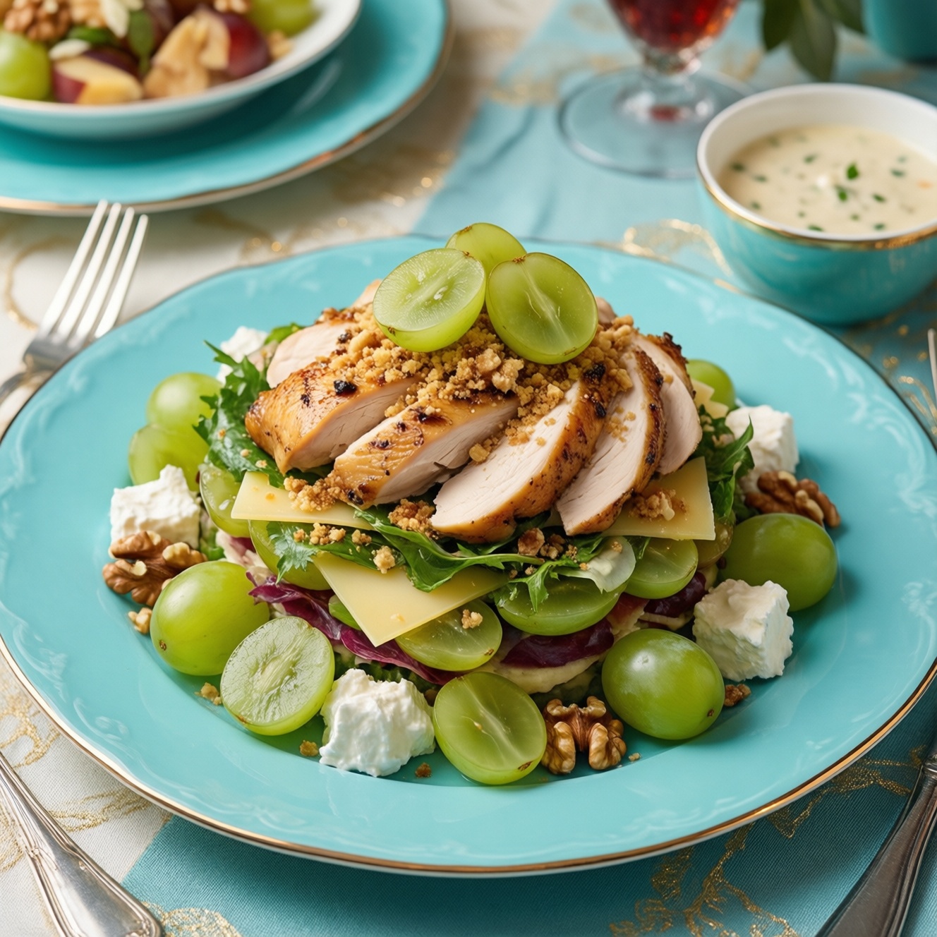 В классическом варианте соус - майонез, и он действительно даёт ту самую "праздничную" кремовую плотность. Но сегодня популярны более лёгкие решения: натуральный йогурт, сметана или смесь йогурта с горчицей и каплей лимонного сока. Такой подход сохраняет узнаваемый вкус, но делает салат менее тяжёлым. Если вы просматриваете салат тиффани с курицей и виноградом рецепт и выбираете вариант для большого стола, соус стоит продумать заранее - именно он "склеивает" ингредиенты в единый ансамбль.